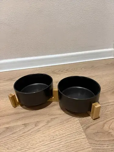Миска двойная керамическая для домашних животных на деревянной подставке(чёрная)